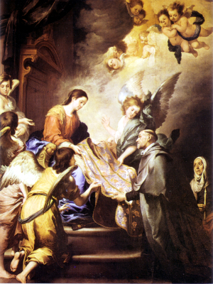 «Ven acá, buen siervo de Dios; recibe de Mi mano este pequeño don que te traigo de los tesoros de Mi Hijo, que es justo tengas un vestido sagrado y bendito en los cielos, para que uses de él solamente en Mi día. Y sabe que, por haber tenido siempre los ojos de la fe fijos en mi servicio, en la vida eterna te regalaré con otras dádivas.»